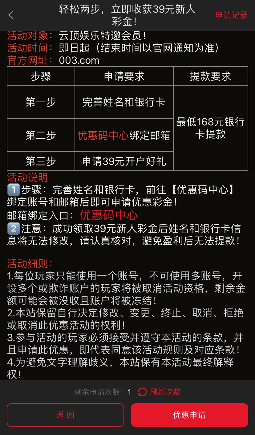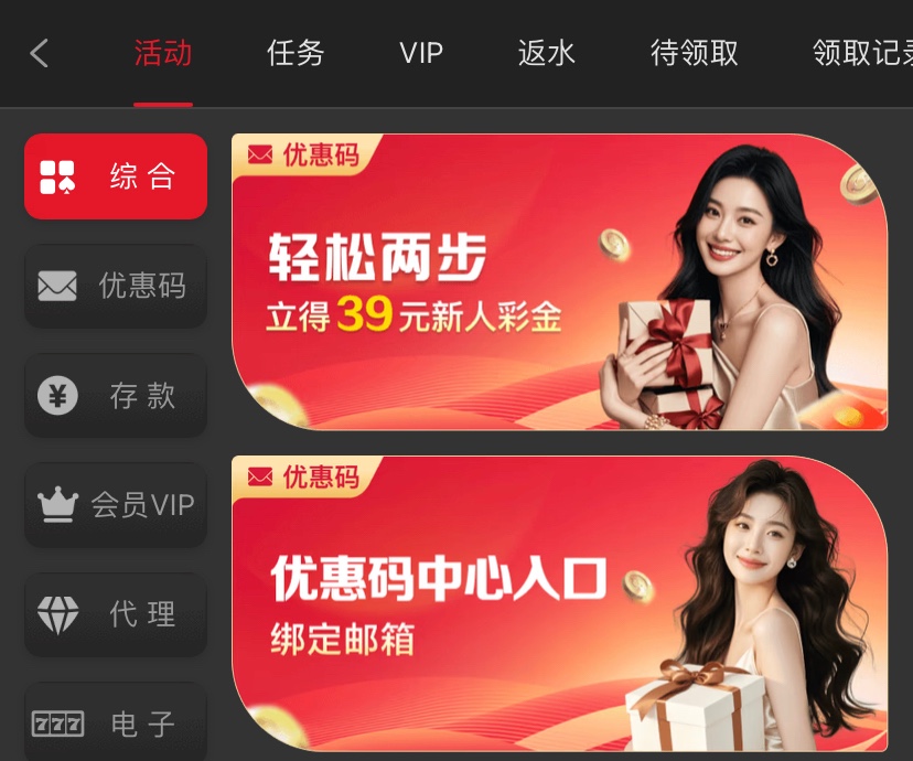 注册好先去安全中心绑定手机号和邮箱在绑银行卡,在优惠里找到“优惠码中心入口”绑定邮箱在申请注册送39彩金的优惠,10倍流水最低提现168只可以提银行卡